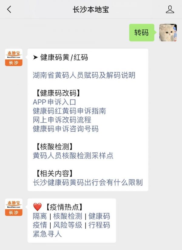 温馨提示:微信搜索公众号【长沙本地宝】,关注后在对话框回复【转码】,即可获取健康码转码申诉方式,包括入口以及申诉电话,黄码人员核酸检测点等信息。