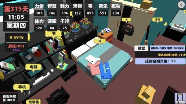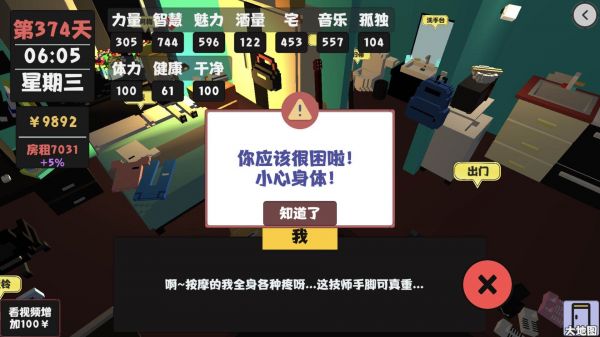 健康值的作用:健康值到达0点游戏直接结束,就像是玩家的血条一样,健康值下降到51点以下会出现两个负面影响。第一个是看病的费用大幅度增加,从400左右变成1500左右,因此前期因为健康值导致游戏结束的玩家不在少数。第二个是会出现无法进行各种活动的情况,同样会导致游戏无法正常进行,因此合理的控制好健康值是玩下去的关键。