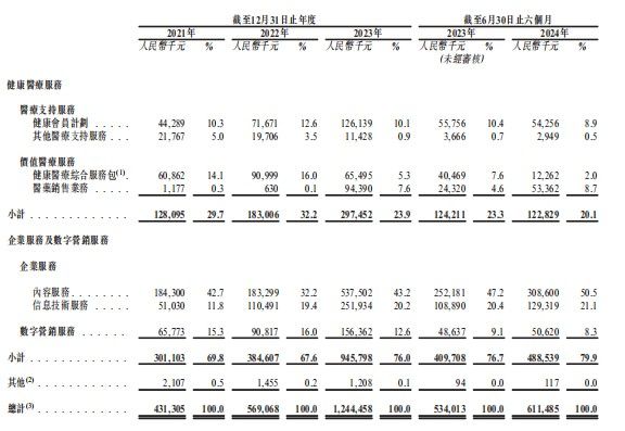 2021年至2024年上半年,健康医疗服务收入分别为1.28亿元、1.83亿元、2.97亿元和1.23亿元,分别占公司总收入的29.7%、32.2%、23.9%和20.1%。同期,企业服务及数字营销服务收入分别实现3.01亿元、3.85亿元、9.46亿元和4.89亿元,分别占公司总收入的69.8%、67.6%、76.0%和79.9%。