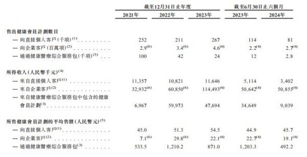 数据显示,2020年至2022年,公司健康会员计划业务中,来自直接个人客户的收入分别为1135.7万元、1082.1万元1164.6万元及340.2万元。2022年公司向直接个人客户销售健康会员计划的平均售价同比提升6.3元至51.3元,但并没有带来收入增长。