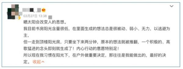 “晒太阳会改变人的思想。”一位博主分享了自己的经历: