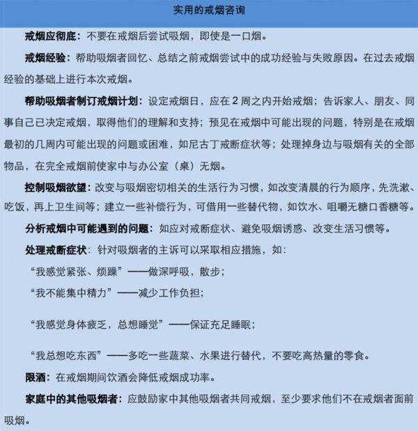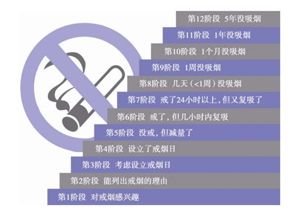 戒烟一般要经历从“没有想过戒烟”到“完全戒烟”的过程。因此,对于戒烟干预的结果,不应简单地理解为“戒”或“没戒”,而是递增的、阶段性的“成功”过程。多数吸烟者会经历全部或大部分戒烟阶段,最后才完全成功戒烟。