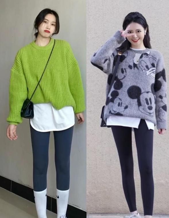 中长款的毛衣在秋冬季节也是穿搭的好选择。宽松的毛衣给人舒适慵懒的感觉,对于整体身材的包容性也更强。搭配弹力较好的芭比裤时,能够使双腿更加纤细。宽松的毛衣可以选择一些亮色系搭配,这样更时尚吸引眼球。如果毛衣版型较短,可以采取叠搭的方式,内搭一件长款的白色T恤,白色T恤的下摆能够遮盖腰臀部位置,也更加轻盈显瘦。像这种宽松的基础款毛衣叠搭白色T恤的穿搭方式,层次感清晰且时髦俏皮。再搭配上紧身的芭比裤,双腿瘦又直,整体造型十分利落。