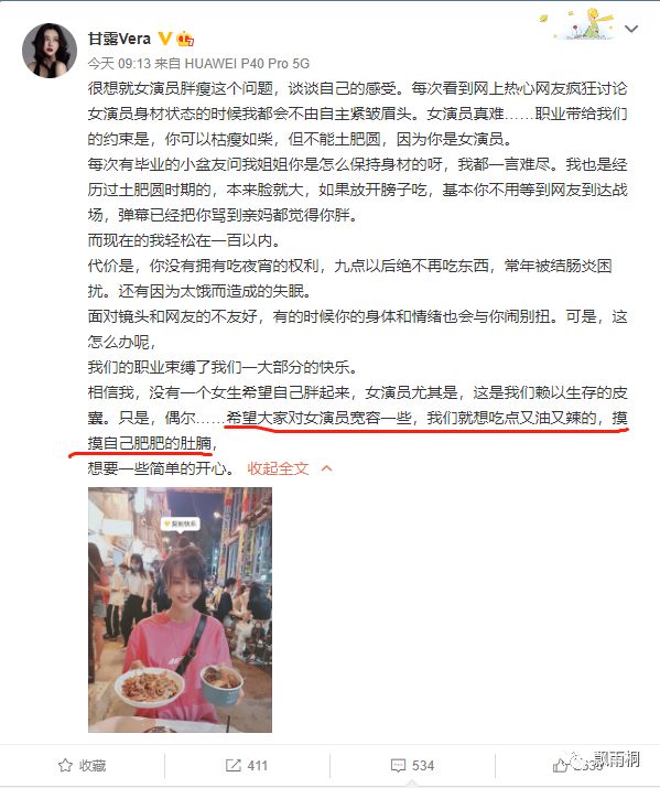作为演员、也作为明星,身材管理也是个人修养吧?当然,为了角色需要增胖的可以有、减肥的可以有。但,为了这个而抱怨——至于嘛?第一个跳出来的是张馨予:“胖了以后世界对我们并不友好”,“一段时间经历了无糖无碳水的减肥期,知道很不健康,但见效快。”紧接着,甘露也出来发了一篇小作文:“我们就想吃点又油又辣的,摸摸自己肥肥的肚腩。”这个,真是职业的约束?