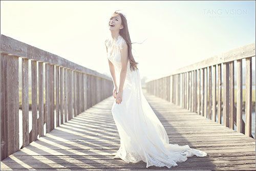 我们还可以使用从下往上拍的设计技巧,这样可以适当的拉长身材,从而让婚纱照画面达到纤细高挑的效果。所以不用担心自己身材矮小等问题,只要幸福这些都不是问题。