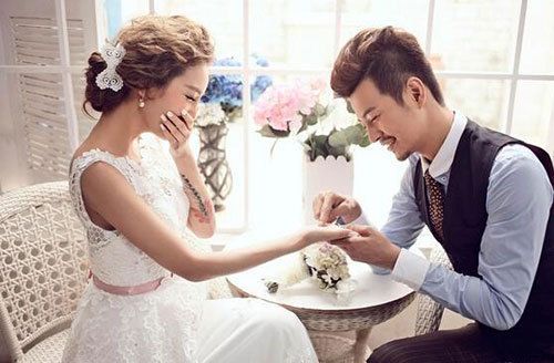 觉得自己脸型不够完美有点大,那可以采用手托脸部的婚纱照姿势,视觉上弥补脸部不足。
