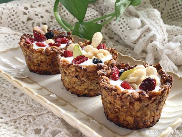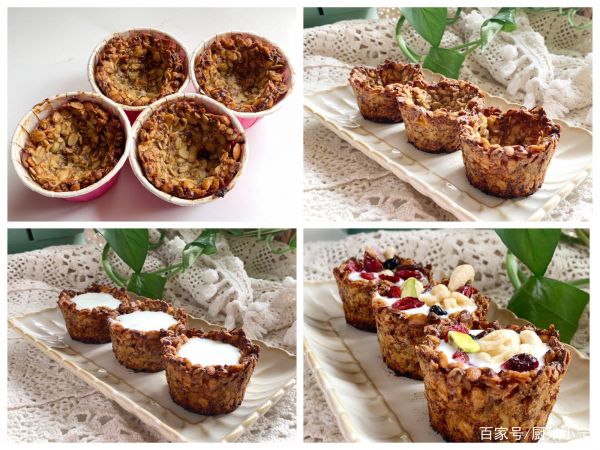 2、烤箱180度预热,烤20分钟,然后观察一下上色情况和杯底的软硬程度,底部如果特别软的话再相应加时间,一直考到颜色变成褐色,脱去纸杯,加入酸奶和坚果即可。