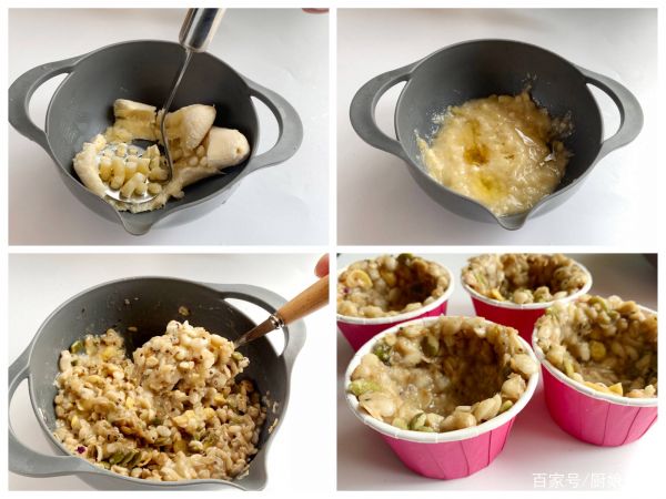1、把香蕉压成细腻的香蕉泥,然后加入少许橄榄油,少许蜂蜜搅拌均匀,然后加入燕麦片,调整成黏稠的、有可塑性的状态,放入一次性的烘焙纸杯中,整理成小碗的形状,要让燕麦满一些,因为做好以后会回缩。