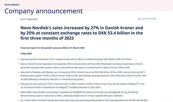 5月4日,诺和诺德公布了2023第一季度财报,据财报显示,2023第一季度营收533.67亿丹麦克朗(约合547亿美元),同比增长27%。净利润为198.14亿丹麦克朗,(约合29.4亿美元),同比增长39%。