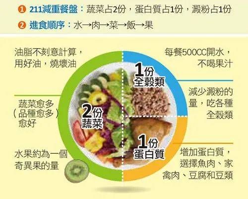 所谓211减肥法,其实就是把饮食中的食材分为三种:主食、蛋白质和蔬菜,每餐中食材按照蔬菜:主食:蛋白质=2:1:1的比例安排。